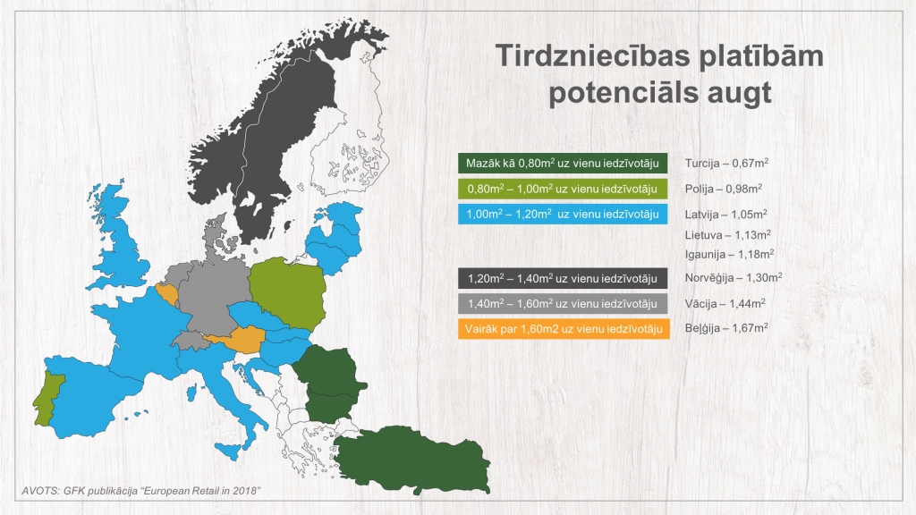 Comparing retail markets in different regions of Europe, the average sales space in Latvia per one inhabitant is 1.05m2, which is one of the lowest indices in Europe, and the lowest among the Baltic states, according to the industry overview “Maxima Retail Compass” conducted by “Maxima Latvija”.